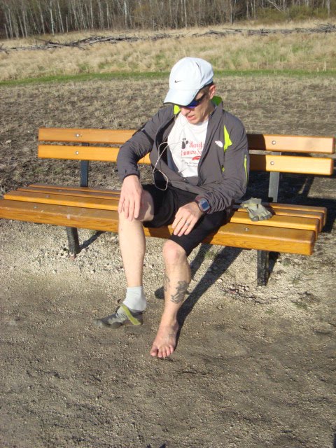 Anyway, to replace this Nicole and I decided to run 50km on Saturday around the city and find a route to have Gail and Andy run Sunday morning with us playing the support team. So a very early start of 6:00 am (after picking up the babysitter, thanks Oceane) started us on our way. Now the longest distance I have run is 48.19 km, and Nicole was 45.51 km, so this was going to be personal bests for the both of us. Now to keep with the crappy weather theme, it was quite chilly yesterday morning, so until my feet warmed up, I decided to start with the Vibrams (plus I figured Nic and I should match). This of course carried on till we got to the park and the duck pond, where we had a quick brake before heading back out again. So we headed out from the park, me shoeless and Nic wearing her customary Vibrams. Worked our way to the Assiniboine Forest and down a frozen dirt path back towards Hart’s Trail, with a stop to put my Vibrams back on. With the frozen trail, not really picking up the sharp stones very well, and the concern in the back of my mind that we still had a long way to go and I didn’t want to damage my feet, I figured it would be best to wear the Vibrams until I got more comfortable.
